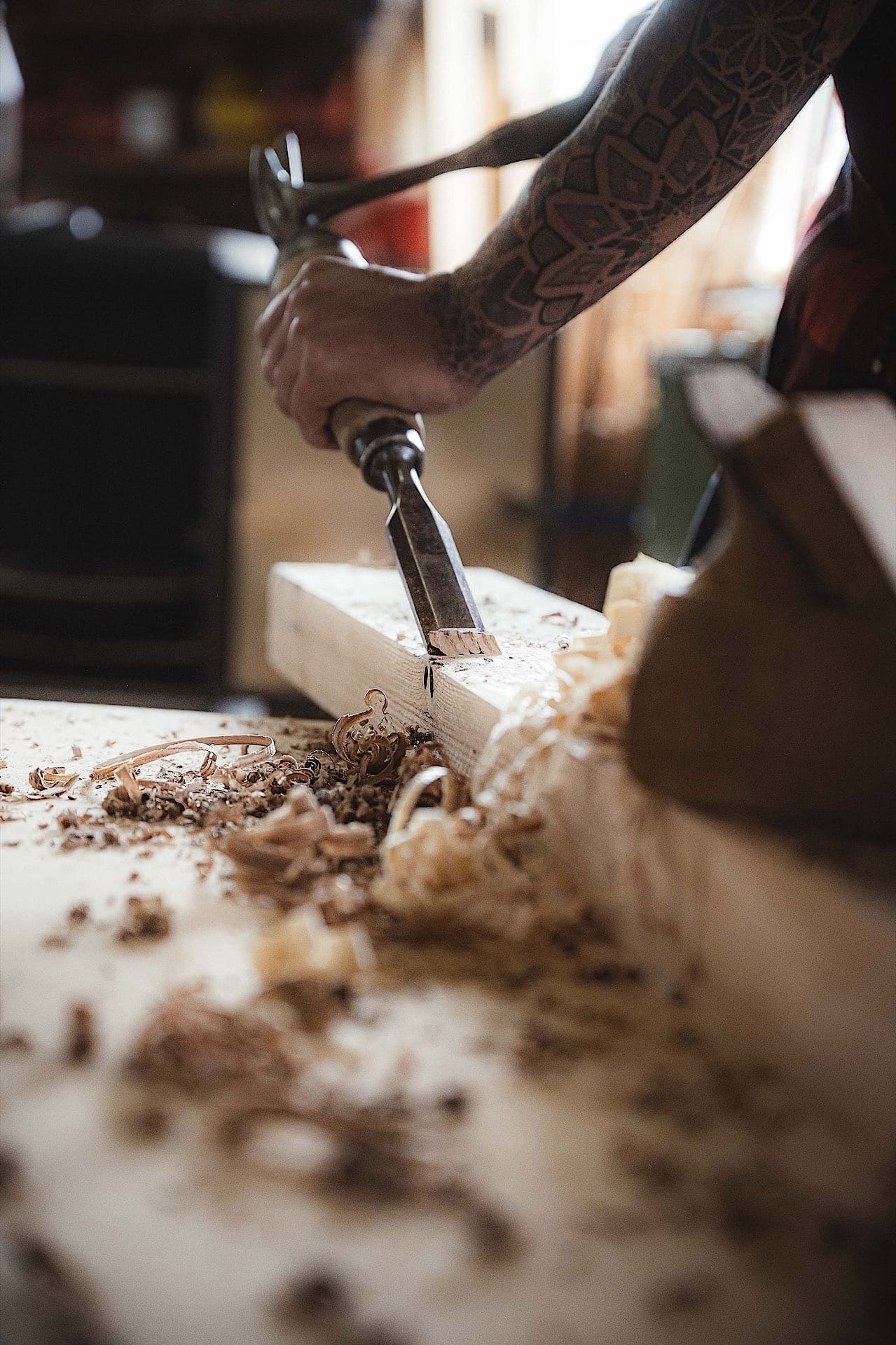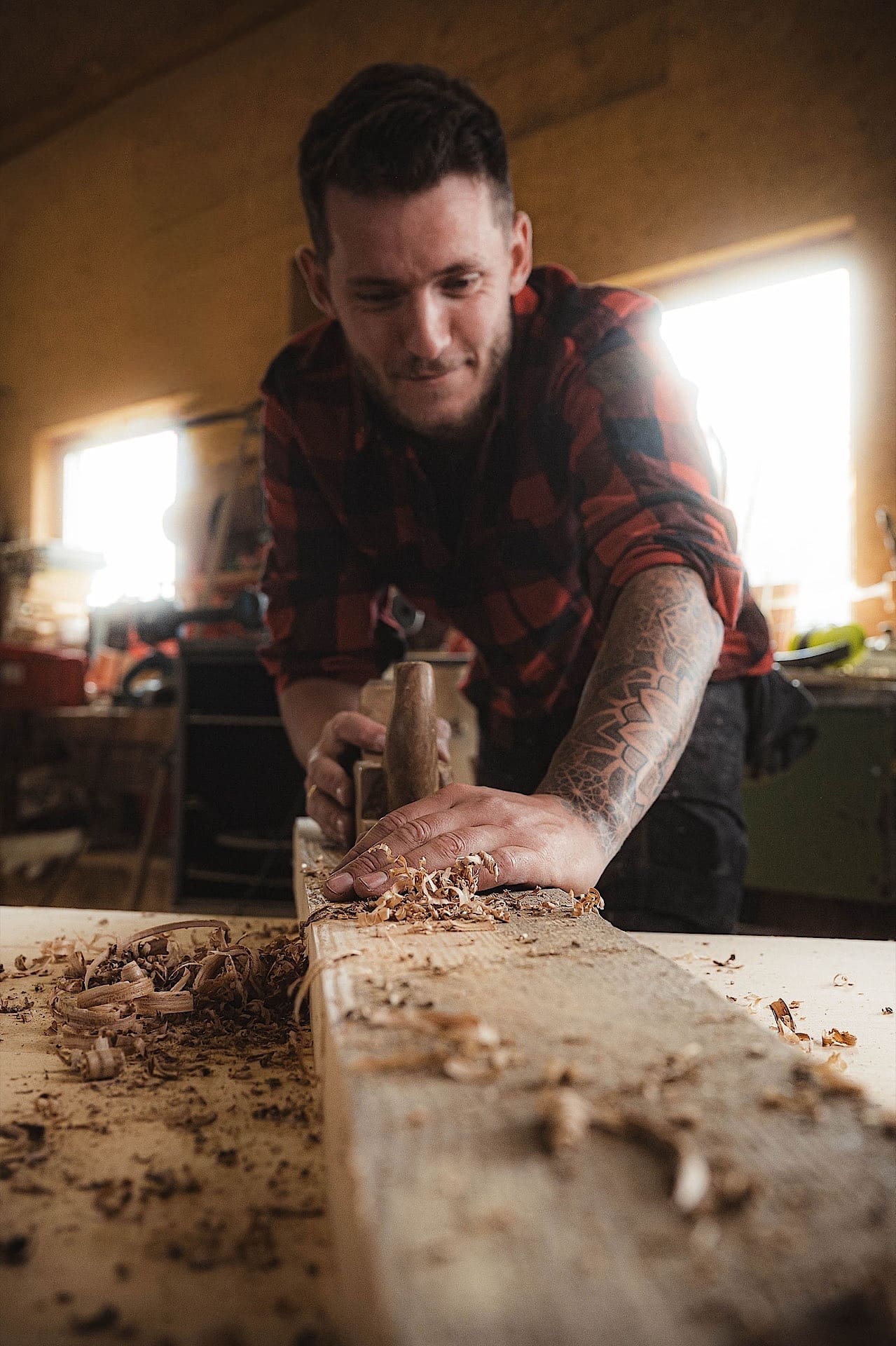 Handwerk ist für uns kein Job, sondern eine Lebenseinstellung. Wenn der Hobel über das Holz gleitet, die Späne fliegen und der Geruch von frisch bearbeitetem Holz die Werkstatt erfüllt, sind wir in unserem Element. Diese Bilder fangen mehr als nur Arbeitsschritte ein – sie zeigen die Hingabe, die tätowierten Arme, die den Hammer führen, und die rauen Hände, die jedes Detail perfektionieren.