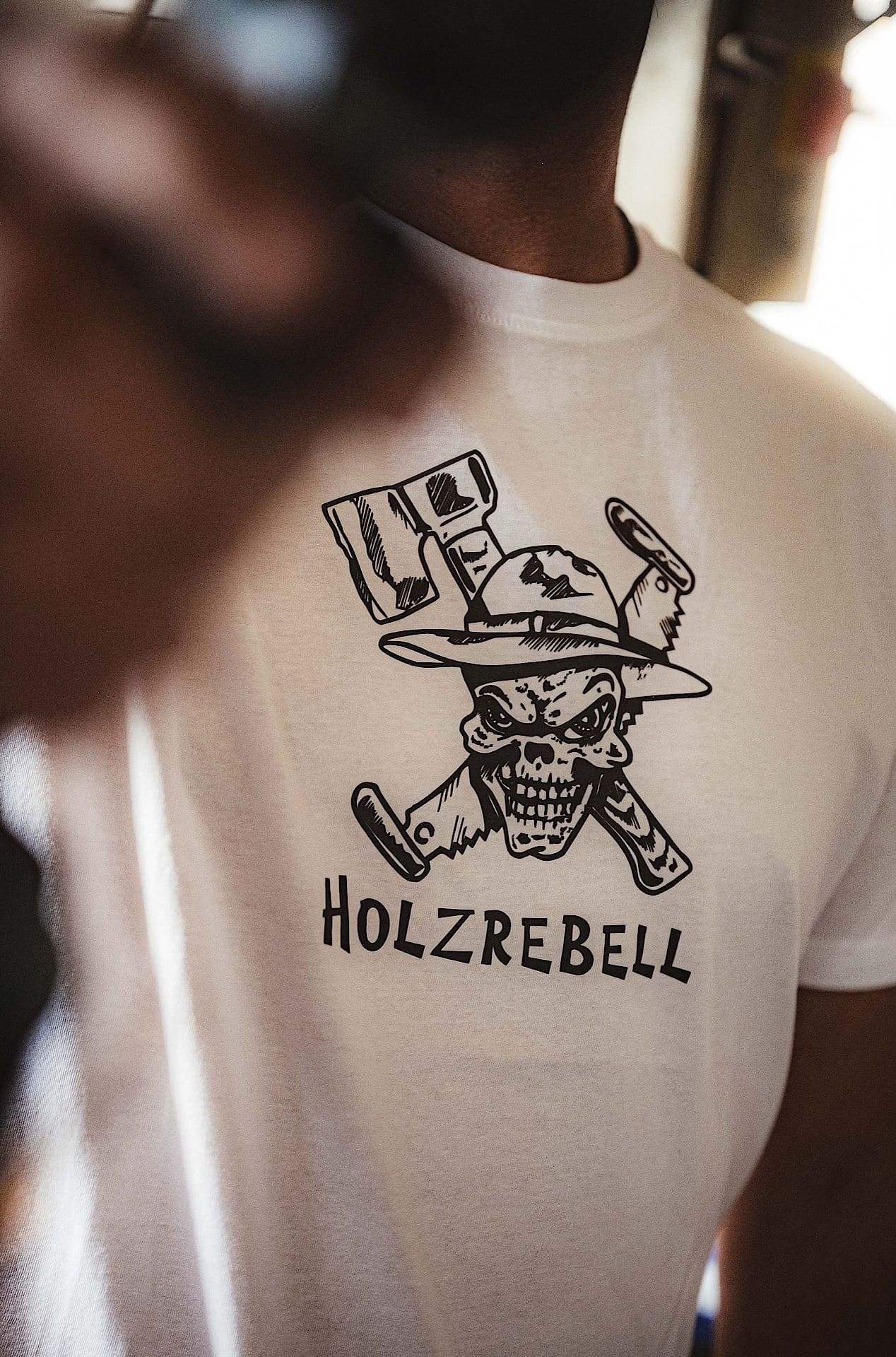 Nahaufnahme eines rot-schwarz karierten Hemdsärmels mit einem Aufnäher mit einem Totenkopf, gekreuzten Werkzeugen und dem Wort HOLZREBELL.